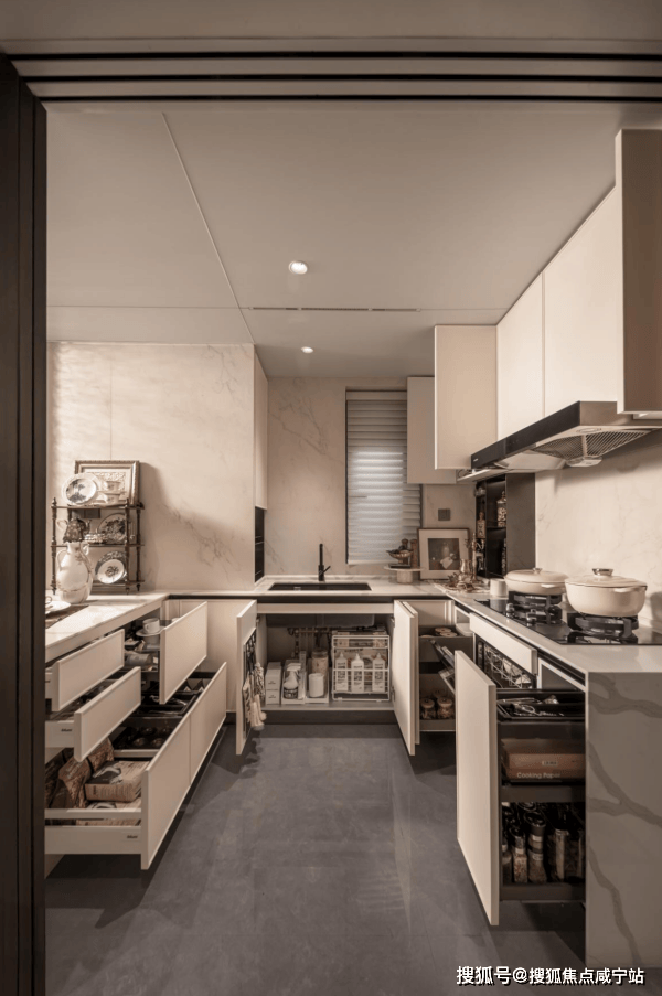 厨房更是堪称美食达人的天堂,集成一系列多功能调味拉篮、定制谷物抽屉等,收纳有序,油盐酱醋间的分类放置烦恼一次性得到解决,琐碎繁杂不再。