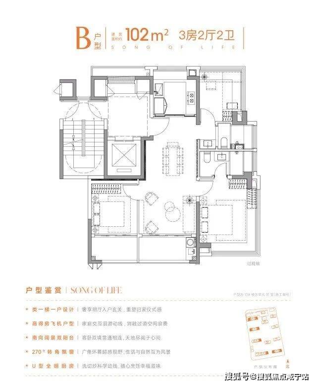 91㎡三房:U型厨房+6.8米景观阳台,得房率79%;