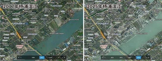 作为黄浦江畔的压轴板块, 杨浦滨江的建设速度是有目共睹的,下图是2017-2025年杨浦滨江的卫星影像变化图,几乎是一年一个样!