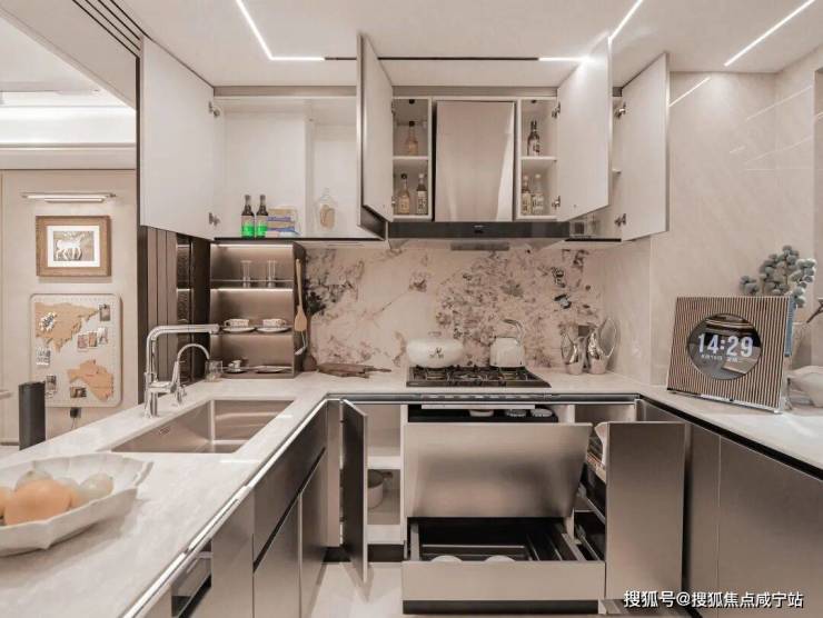 如:137㎡F户型,同样设计了双270°L型飘窗(南向主卧+北向书房)、南向双次卧飘窗、餐厅飘窗,甚至连卫生间和厨房都被飘窗环绕;厨房烟道外移设计,更形成 U型操作台面,增加操作空间,飘窗抽屉,增加收纳空间。