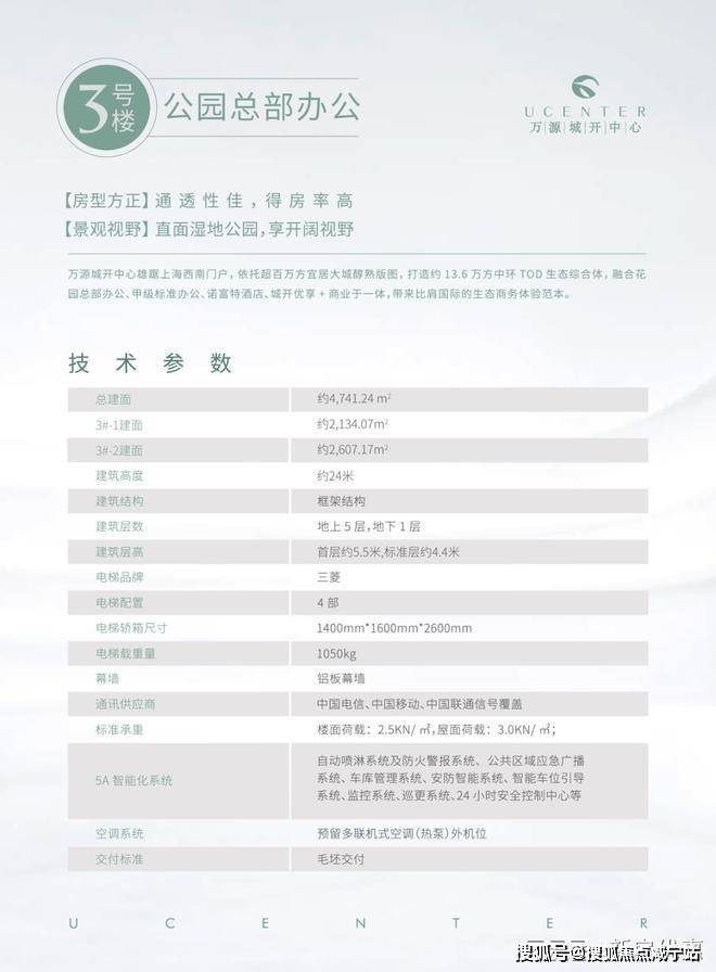 【独栋产品亮点】1. 直面10万方的湿地公园2. 专属独立楼宇冠名权3. 衍生采光地下夹层,部分楼层退台体验,屋顶花园,使用率高4. 超高得房率,双享空间灵活布局【项目参数】层数:地上5层,附地下夹层使用权,地下2层车库层高:首层5.5米,标准层4.4米电梯配置:4部,三菱交付标准:毛坯