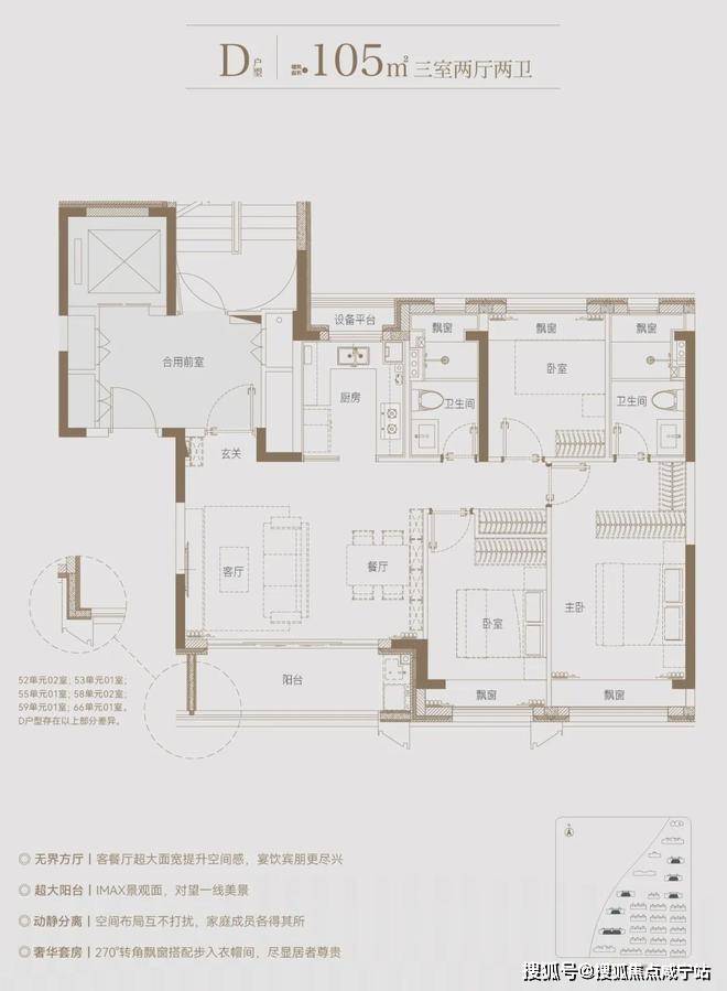 边套的餐厅、主卧和次卧,设置有多个270°全景飘窗,室内通透明亮。