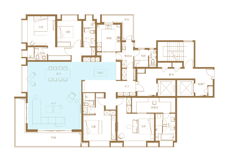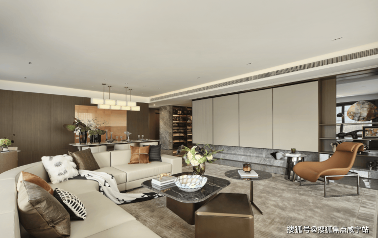 金融湾·晶建面约325平大平层约75平奢阔客厅,接近普通的两居室的面积,设置了临港罕见的LDKB中西双厨、三厅设计,客餐厨阳台四位一体化,兼顾开放共享与社交,奢华与实用完美结合,成就高净值人群的社交宴饮气场。