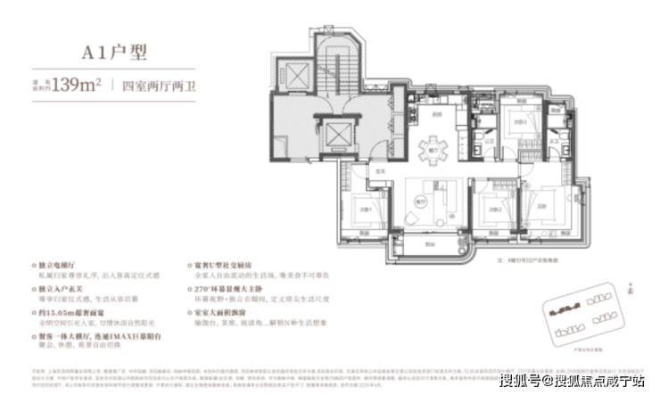 建面约139㎡4房户型,套数不多,但产品力绝对惊艳。四开间朝南,约15.05米宽的南向横厅、约1.6米进深的奢阔阳台,中环顶级享受的既视感。主卧约4.45米的进深,约4米大面宽(含飘窗),配合270°转角飘窗,是目前市面上产品力高配的户型之一,值得一冲!