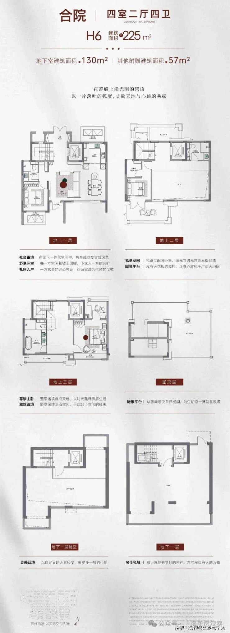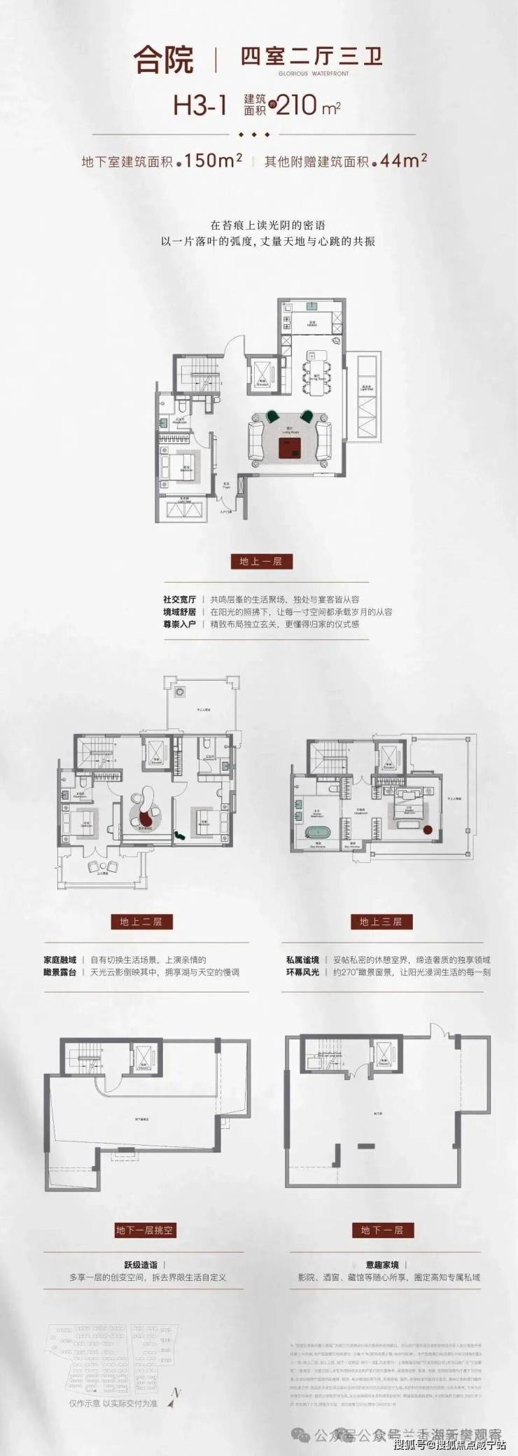 合院:建面约190㎡三室两厅三卫、约210-230㎡四室两厅三卫/四卫,附赠地下室+露台,总价预计约2000万;3层地上+地下室设计。