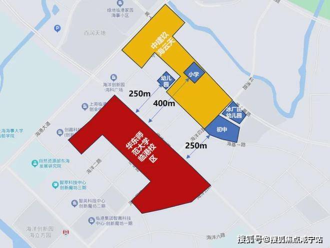 目前103板块除冰厂田幼儿园已官宣,其余学校皆未挂牌。我们可以通过简单的区位图进行梳理,发现距离华师大临港校区(规划中)最近未挂牌的学校,是毗邻中建玖海云天的幼儿园、小学以及初中。