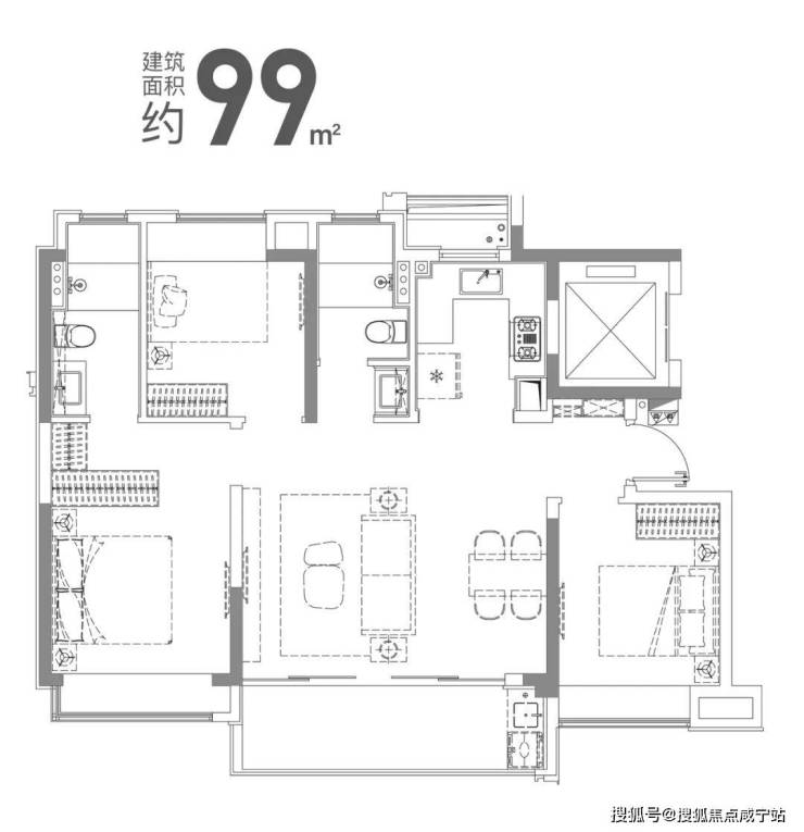 该户型三开间朝南+大横厅的设计,让这个户型有着不亚于宽绰大三房的尺度感和采光面,再加上宽景阳台的设计,这个户型的居住舒适度在同面积段户型中,称得上出类拔萃了。