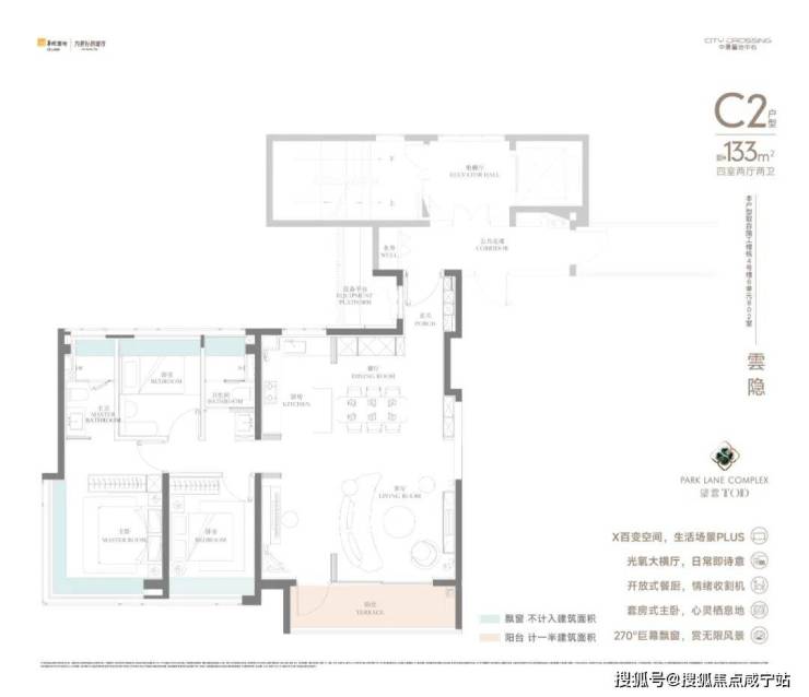 大尺度:四开间朝南+豪华主卧的约270°无柱转角飘窗+横跨客厅和次卧的宽面阳台,整个户型的尺度感拉满。