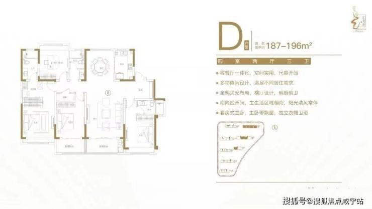 建面约187-196㎡四室两厅三卫户型特点:户型方正,南北通透,动静分区有序;双套房设计,卧室带飘窗,独立卫生间;客餐厅一体化,尺度开阔,全家共享;全明采光布局,告别暗房,明厨明卫;南向四开间,阳光清风常伴。