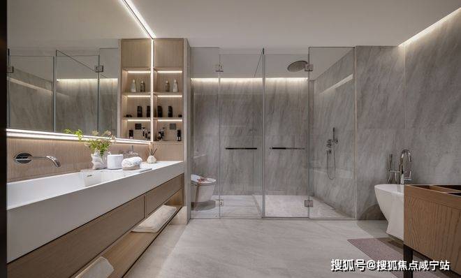 选材上也是相当精细!严选成本高昂的大规格进口瓷砖,减少墙面拼缝,呈现顶级星级酒店卫浴的整体感,达到目前样板间的高阶精装效果~