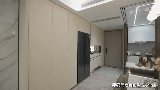 创新的“S墙”设计,在分户墙处增加“凹型空间”,嵌入式冰箱可以巧妙隐藏。“冰箱外移”为厨房操作台面和储物空间提供更多空间,优化了餐厨区域的动线。