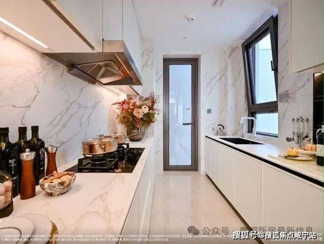 3)超配精装,厨房区域标配美诺6件套,涵盖油烟机、灶具、洗碗机、蒸烤一体机、嵌入式冰箱等,搭配威乃达橱柜,厨房”一装封神“!