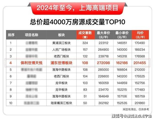 自2024年至今,上海新房总价超4000万的房源成交量TOP10豪宅中,入市仅一年的保利·世博天悦以108套成交量跻身第四,连带部分未推4000万+的总房源量超220套!