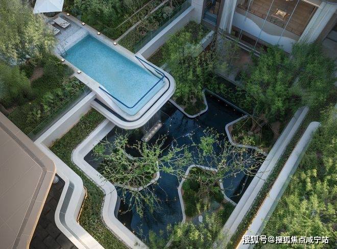 约420㎡下沉式庭院,嘉定首见的悬浮水池,搭配约4.3米飞瀑。