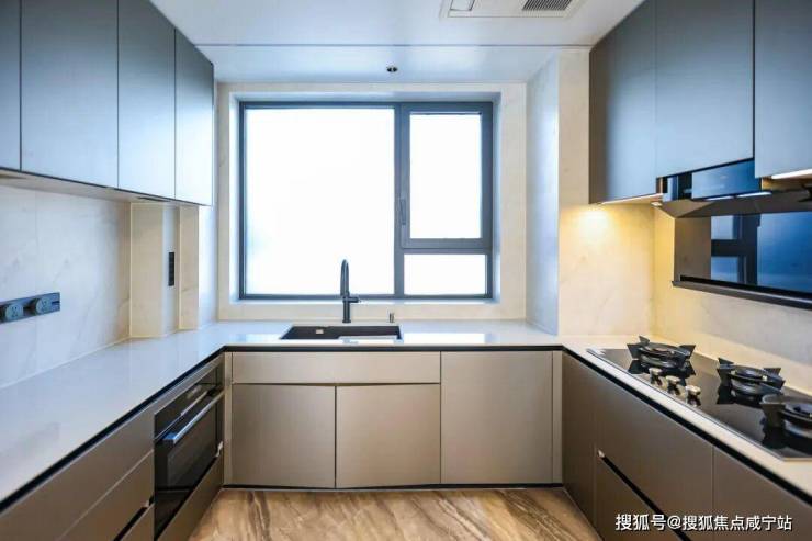 厨房为U型布局,配备博世四件套厨电,包含三眼灶、油烟机、洗碗机、蒸烤一体机,还有科勒抽拉龙头及日立厨房空调等高端品牌,中岛与飘窗休闲区相连,扩展了操作与互动场景。