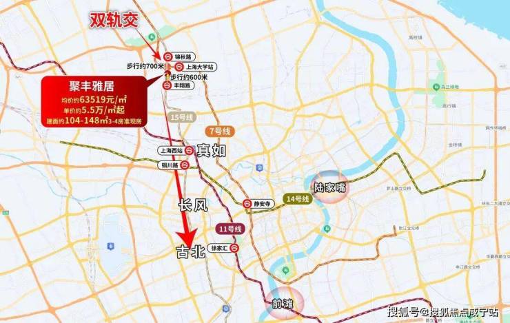 项目步行到15号线丰翔路站约600米,步行到锦秋路站约700米,15号线是上海产业金线,串联真如、长风、古北等高阶区域;