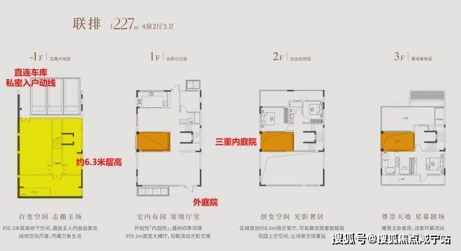 约193-227㎡联排别墅3重垂直内庭院+约36㎡外庭院+挑空大横厅+双层挑高地下室,这不仅仅是超高得房率,更是有天有地的终极生活形态。总价仅需900万起即可拥有,相当于均价约4.8万/㎡!