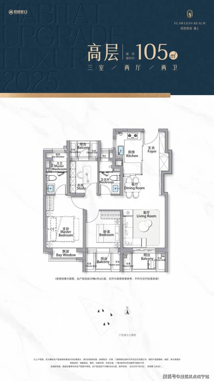 首先,是实用面积的跃升。建面约105㎡户型的三个阳台只算一半面积,花池不算面积,主卧自带非承重结构的飘窗,折算下来的空间是实打实的,远超市面上同面积段其他产品!