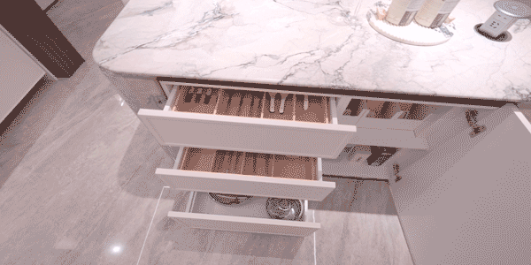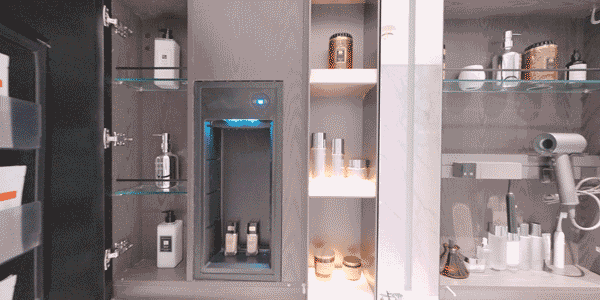 洗手台面为奢石台面,侧端设置金属收纳开放格,皮革饰面柜抽屉可做储物功能,同时定制镜柜内部也配备了美妆冰箱+美妆灯条+轨道收纳,可以让各种美妆工具与配饰得以有序摆放。