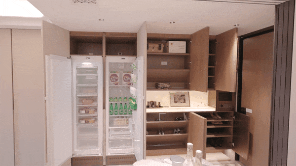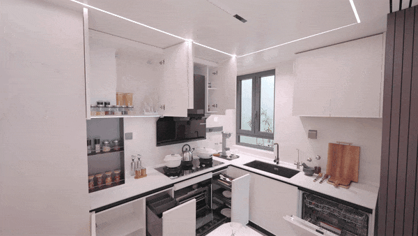 厨房空间,经过精心规划自上而下设置了五层收纳系统,以提升储物效率与便利性: