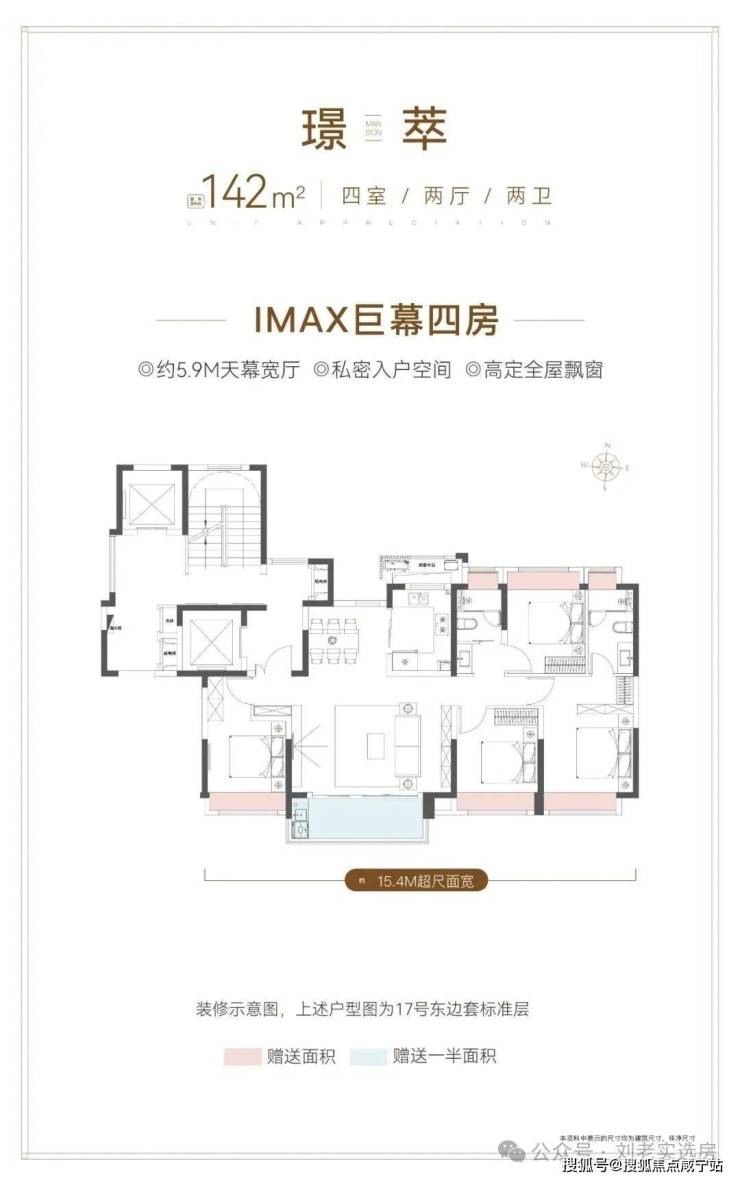 142㎡四房:四开间朝南,三卧朝南,约15.4米南向面宽,总价850万起,同面积段找不到第二家。