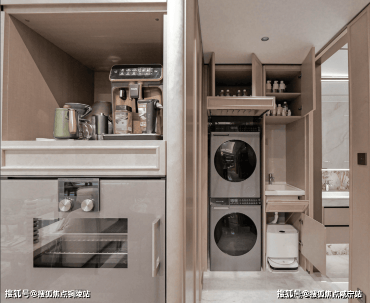 次卫门外,做了小家政空间,洗烘套装上方,嵌入了 抽拉隐形晾衣架 ,偶尔可以挂烘干的衣服。