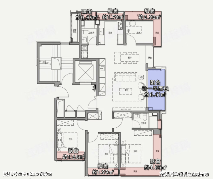 项目百平三房,在计算阳台一半面积+飘窗赠送面积的情况下, 实得率可以达到91%左右 ,完美覆盖了当下普通高层的得房率痛点。