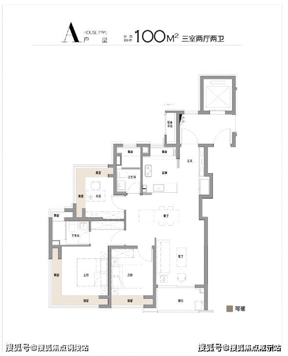100㎡户型,双270°飘窗设计(南向主卧+北向书房),南次卧、厨房、双卫飘窗,厨房烟道外移,飘窗配置抽屉,极致空间利用率。
