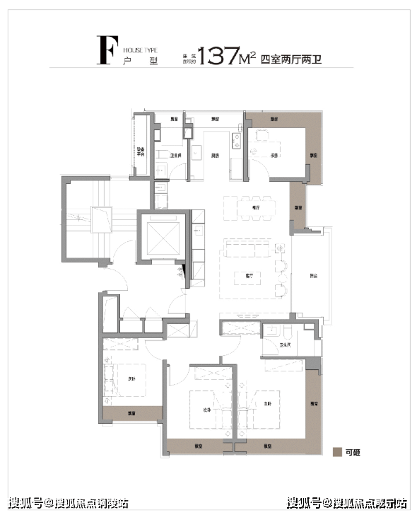 超高得房率户型,飘窗可砸,100㎡A户型,砸完多出约6㎡;137㎡F户型,砸完多出约11㎡,附赠多出来的空间,未来可随家庭需求,灵活延伸。