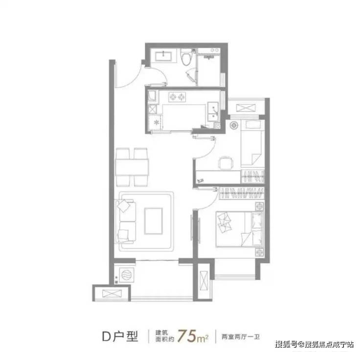 建面约75㎡2房户型,是目前少有的低总价上车的户型。整个户型全明设计,户型方正,南北通透,双开间朝南+主卧带飘窗、客厅带宽面阳台的设计,保证了室内每个空间都能享受到惬意的阳光。