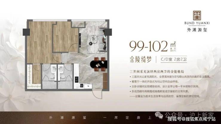 180㎡三房:三开间朝南,主卧套房带独立衣帽间与双台盆卫浴,270°弧形阳台俯瞰苏州河;