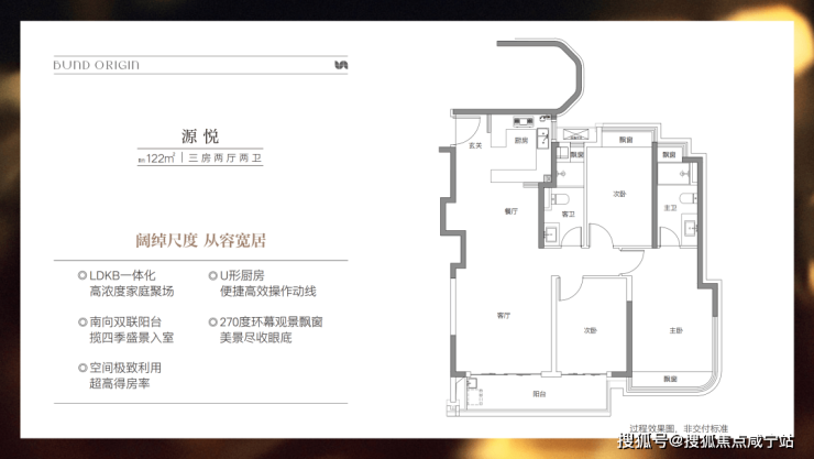 建面约122㎡3房2厅2卫,非常标准的动静分离、三开间朝南户型。几乎保留了前一个户型所有的优势,但在尺度感、私密性和舒适度上又有突破,不管是采光、视野、通风、私密性,还是实用性都十分出色。主卧拥有270度环幕观景飘窗,视野和采光都非常好。