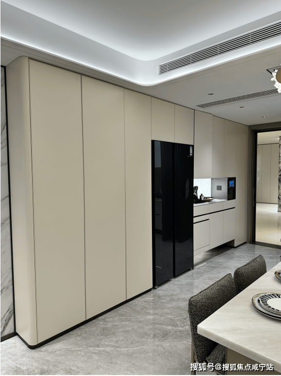 看到约143平户型,厨房岛台和上柜都不稀奇,厨房外的半开放式餐边柜和利勃海尔内嵌式同样也作为交付标准附赠,柜体额外提供接近1立方面积的收纳空间:在约143平户型中,入户玄关收纳区被分为2个部分——一个是进门正对的区域,一个是进门后的步入式区域,两侧都标配有充裕的收纳空间。和约99平户型不同,约143平户型在玄关柜末端还设置有半开放水吧台,丰富生活场景:主卧和约99平户型一样,衣柜更大形成衣帽空间,还交付有半开放式、类似于酒店的迷你吧设计:现场样板房照片长这样:
