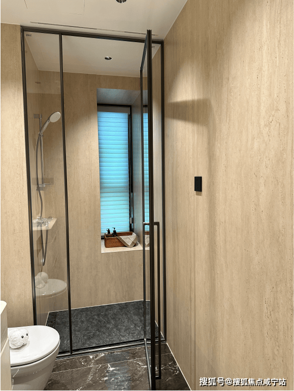 基础硬件都不差,项目在审美上还做了不少创新——卫生间大量采用奢石和石材,比如主卫柜体墙面就是香格里拉翡翠拼花,龙头是冷热分离式,成本更高:次卫则是采用不同风格,墙面统一采用米洞岩板、地面为深咖色瓷砖,黑金配色风格区别于看多了的海派设计,眼前一亮:卫生间下柜同样是皮革包裹交付,标配智能马桶盖板: