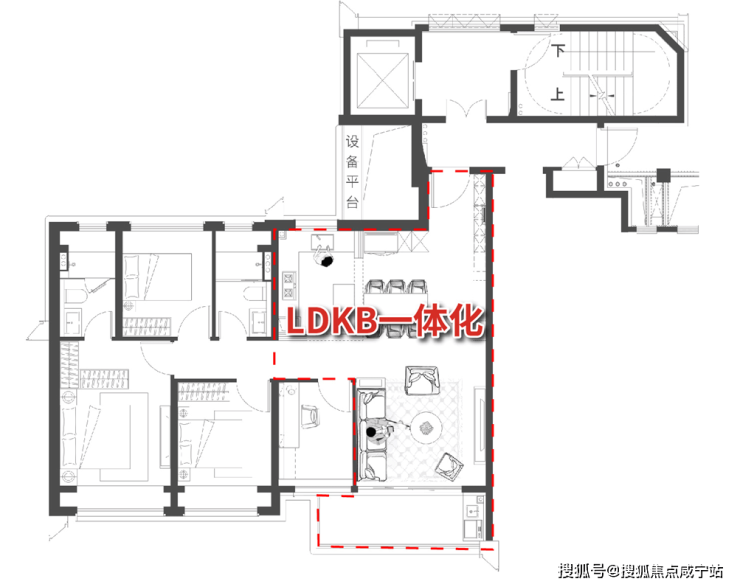LDKB一体化的设计,将客餐厅、厨房融为一体,打破空间便捷的同时,尽可能地提升公区的空间使用率,尺度感超强,可轻松承载会客、家庭聚会、生日派对等场景。