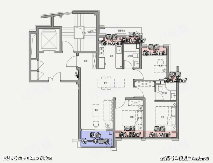 项目百平三房,在计算阳台一半面积+飘窗赠送面积的情况下, 实得率可以达到91%左右 ,完美覆盖了当下普通高层的得房率痛点。
