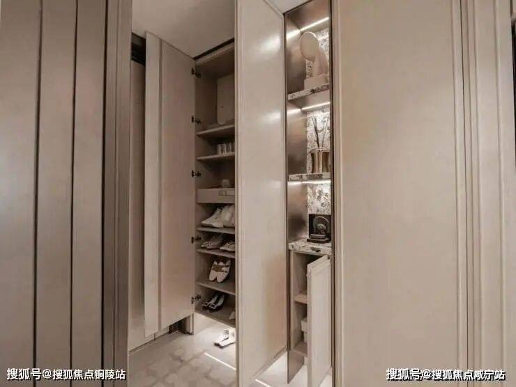 以137㎡户型为例,进门右手边是一门到顶的玄关柜收纳,转角之后,还有一个进深约60cm的豪华收纳,可以用来收纳业主的行李箱、童车、平衡车等等。
