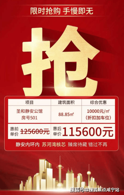 最新信息:苏河湾实景现房「圣和静安公馆」本周推出1席特价房源!建面约88.85㎡,单价仅11.56万/㎡!