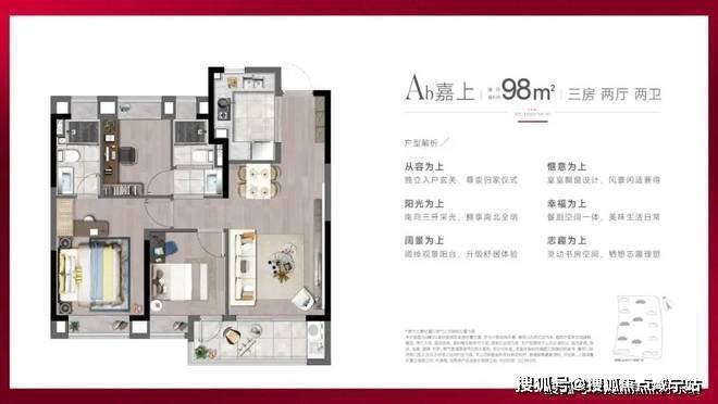 建面约98㎡3房2厅2卫户型,分别是边套、中间套,满足不同人群的居住需求。2个户型都做到了三开间朝南+主卧套房设计+动静分离+全卧室带飘窗,室内采光面非常大,通透明亮,私密性也更强。主卧套房设计,带独立卫生间+飘窗+衣帽间,专属于主人的私密空间。