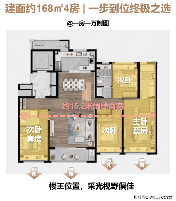 建面约168㎡户型,更是整个板块乃至板块内都非常稀缺的改善大户型,而且还坐拥社区楼王位置,观景视野极佳。