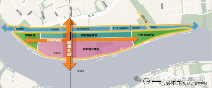 复兴岛也正式被定义为“国际创新创业岛”,围绕“⼀核·两轴·四区”来建设发展,岛上将形成户外文体、文娱、研发孵化、创新创业等四个片区,总体打造未来城市实验区、创新创业和人才集聚区、空间智能创新先行区,形成“科创+艺术+生态”的复合功能。