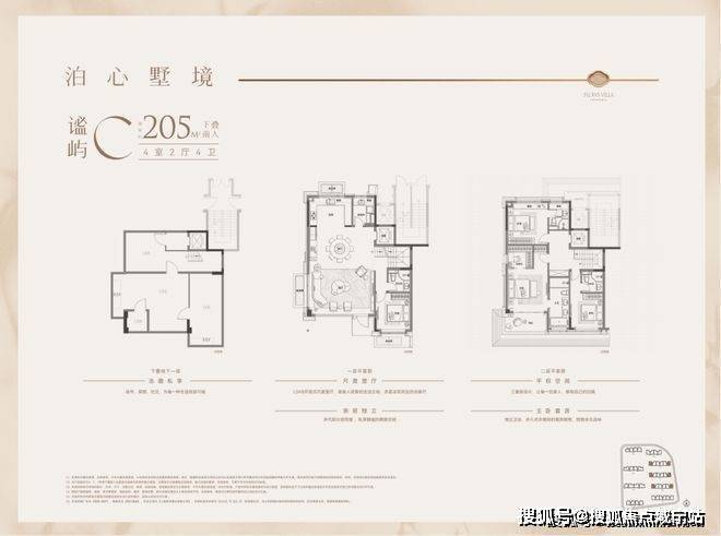 户型特点:下叠边套,南向面宽约9米,客餐厅同宽约5.8米,空间开阔。一楼设南向卧室,采光好且视野佳。二楼为三套房+主卧总统套房设计,主卫南向,可容纳浴缸和双台盆。地下室方正,附赠采光井,利用率高。