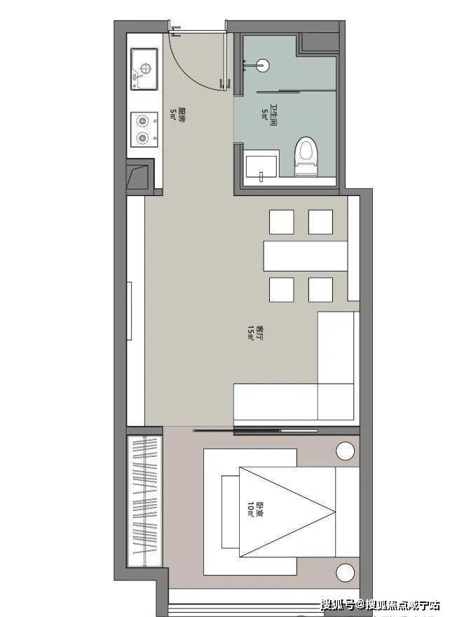 50㎡1房:麻雀虽小但五脏俱全,L型厨房连接飘窗,卫生间干湿分离,尤其适合单身或新婚夫妻。