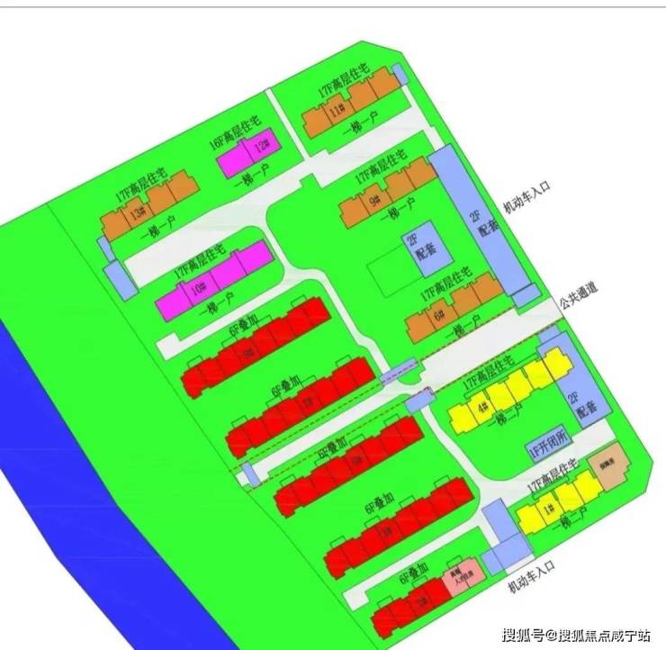 根据方案,项目拟建8栋16-17层高层住宅(含1栋17层保障房),以及5栋6层住宅,共计686户。小区人车分流;车位比约1:1.8,社区内部有水景、下沉式庭院。