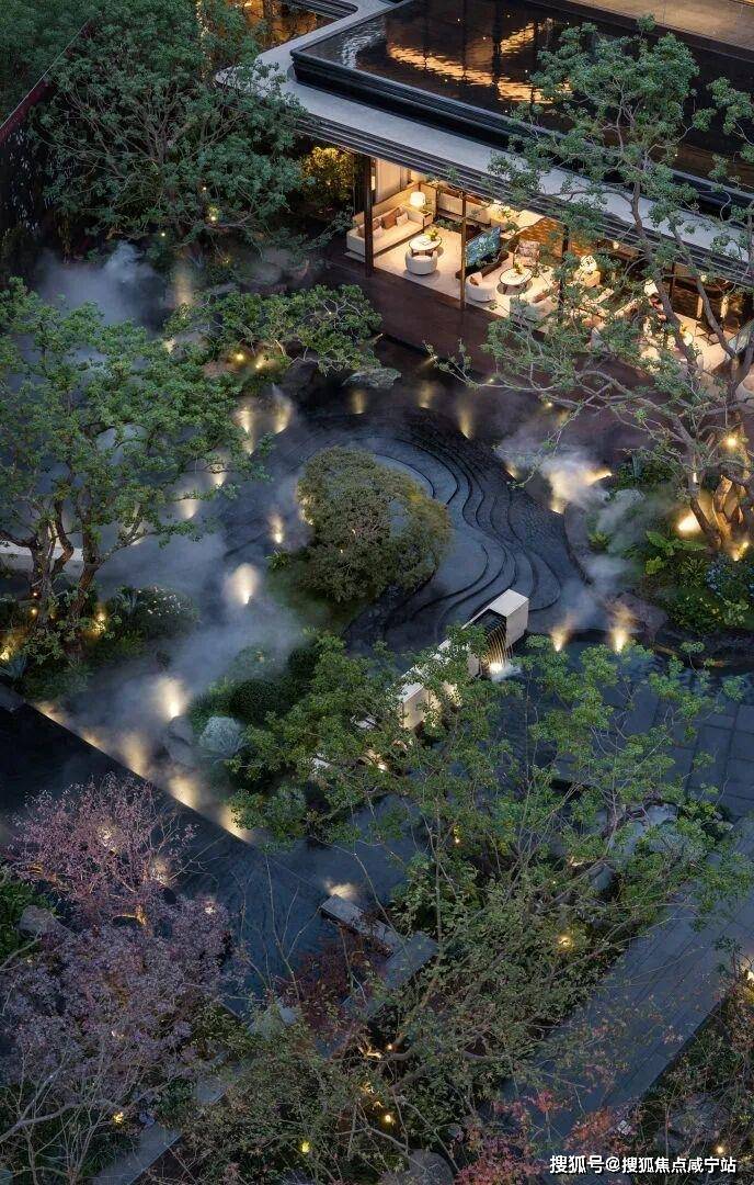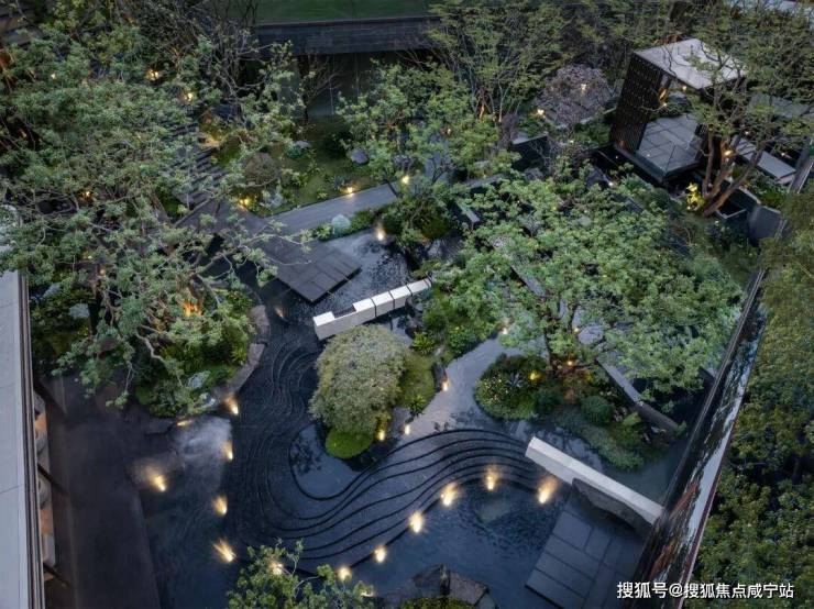 林涧溪谷:以300㎡镜面水为核心,周围环绕叠级景观,水面如镜子般倒映着天空、绿植与石材,分不清哪里是实景,哪里是倒影。