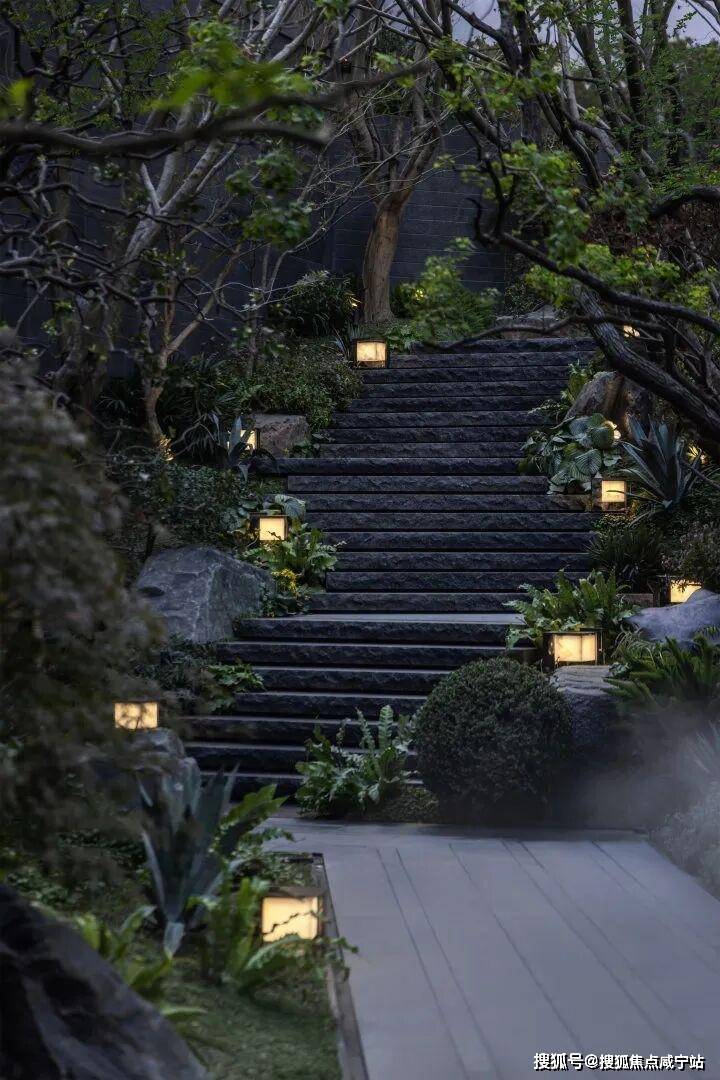 拾阶山林:安哥拉黑奢石铺设的步道,拾级而上,时而穿梭于绿植之间,时而驻足欣赏景观。