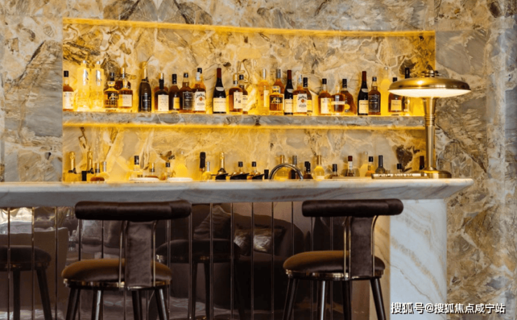 鎏光水吧会客厅,吧台背景采用梵克雅宝奢石,每块纹理独一无二,尽显珠宝陈列美学,可供业主未来会客使用。