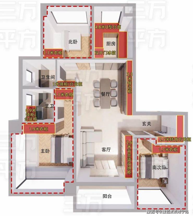 从整体看,建筑面积约112平方米的A1户型的收纳空间对比市面同面积段产品来说相当宽裕,其中2.5米的转角玄关柜、3.3米的餐边柜预留空间、4.8米的厨房操作台面、主卧双衣柜相当亮眼。