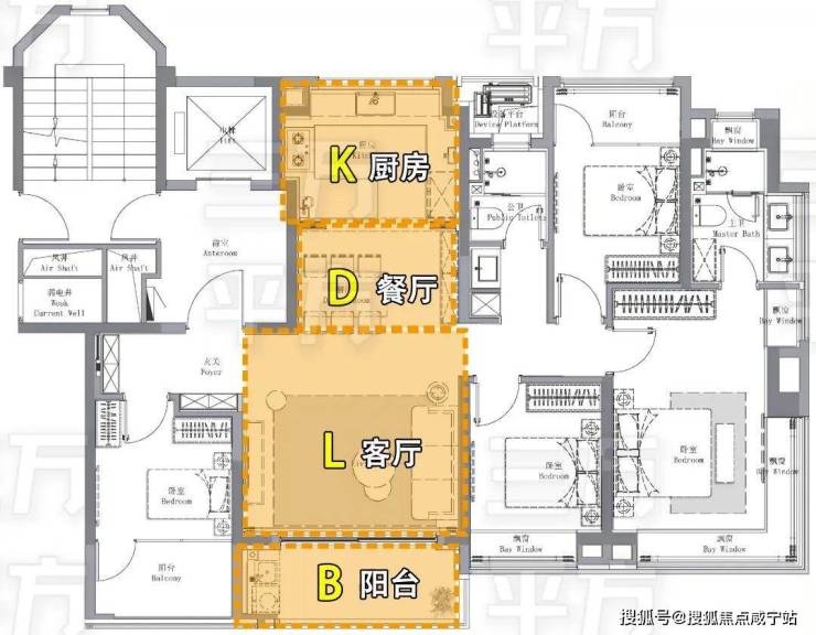 该实得率约87%-91%(红色为飘窗,不计入建筑面积;橘色为开敞阳台,一半计入建筑面积),相当于多了一个朝南宽厅,性价比相当高。