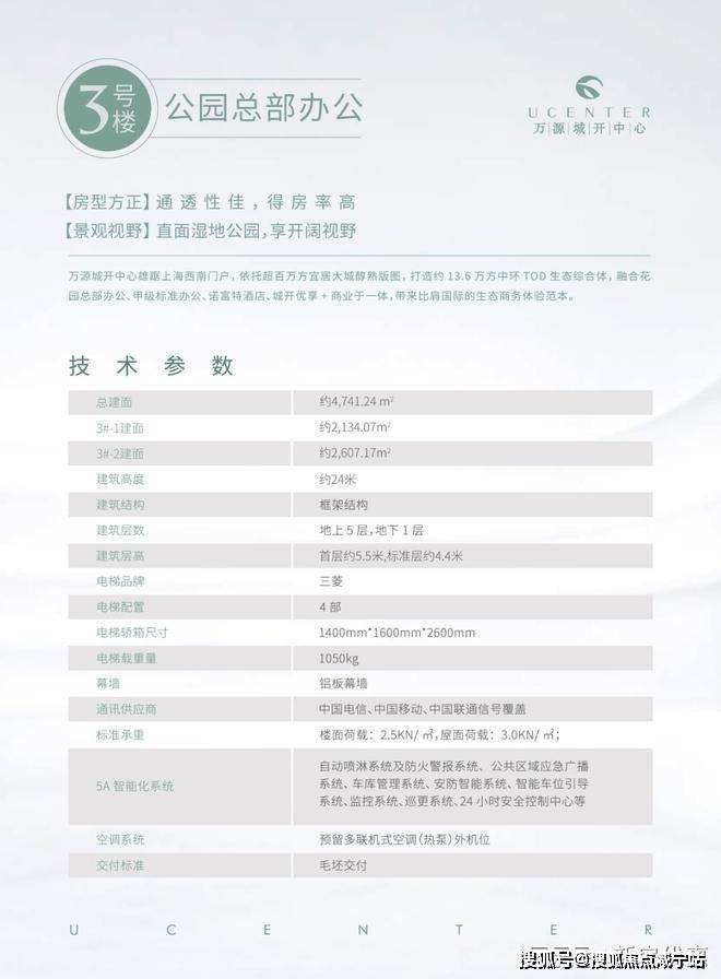 【独栋产品亮点】1. 直面10万方的湿地公园2. 专属独立楼宇冠名权3. 衍生采光地下夹层,部分楼层退台体验,屋顶花园,使用率高4. 超高得房率,双享空间灵活布局【项目参数】层数:地上5层,附地下夹层使用权,地下2层车库层高:首层5.5米,标准层4.4米电梯配置:4部,三菱交付标准:毛坯